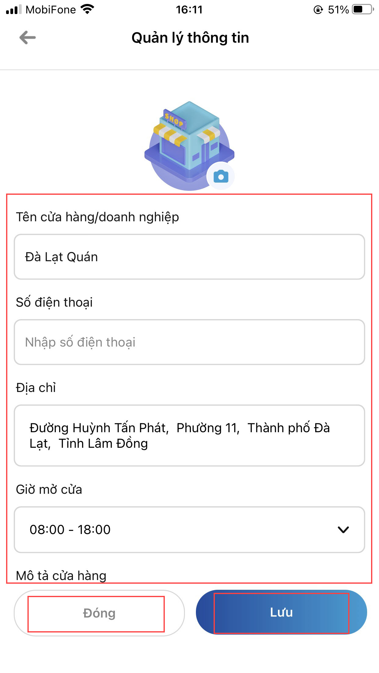 Trên giao diện bạn chọn dòng "Chỉnh sửa cửa hàng", nhập thông tin cần chỉnh sửa và bấm nút "Lưu" để lưu lại, nút "Đóng" để hủy sửa.