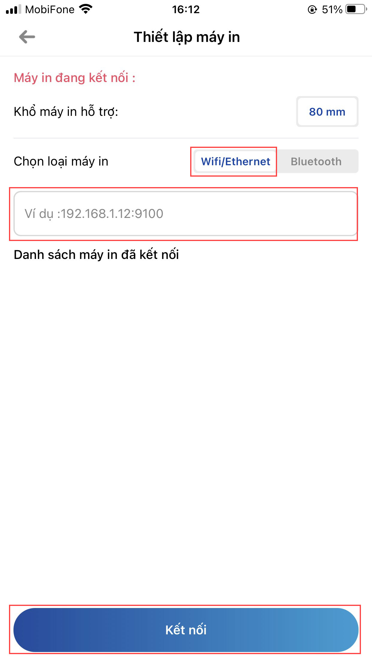 - Loại máy in Wifi/Ethernet: nhập địa chỉ IP mạng theo định dạng như hình, sau đó chọn nút "Kết nối"