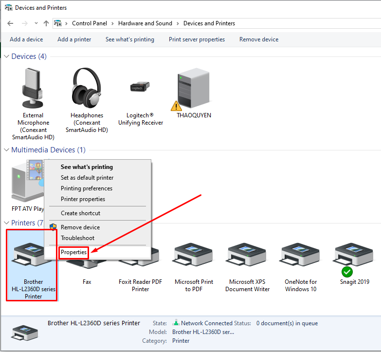 Bước 3: Tại máy in đã kết nối sẵn trên máy tính, bạn click chuột phải >> chọn Properties