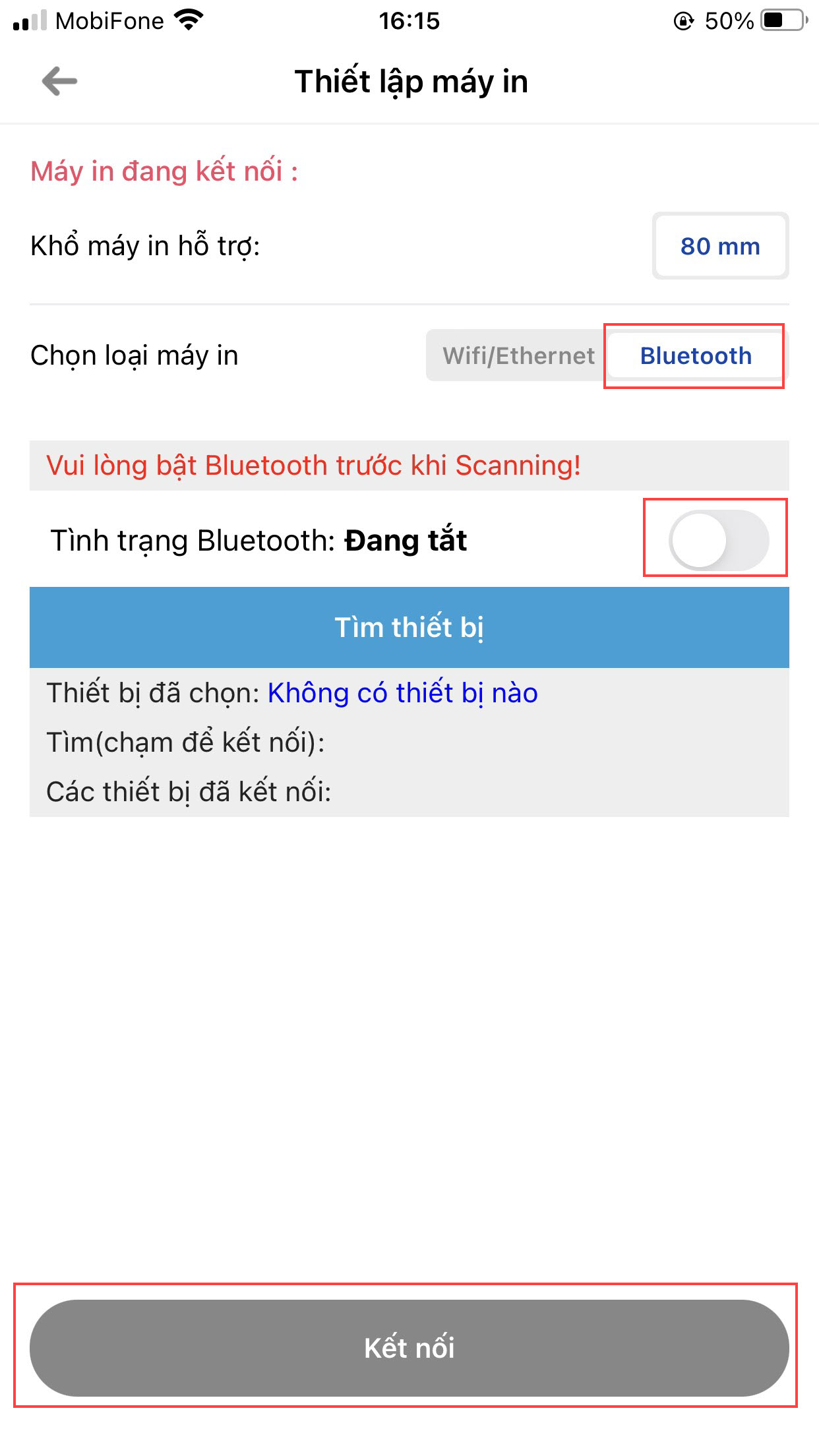 - Bluetooth: bật Bluetooth điện thoại lên và kết nối với máy in