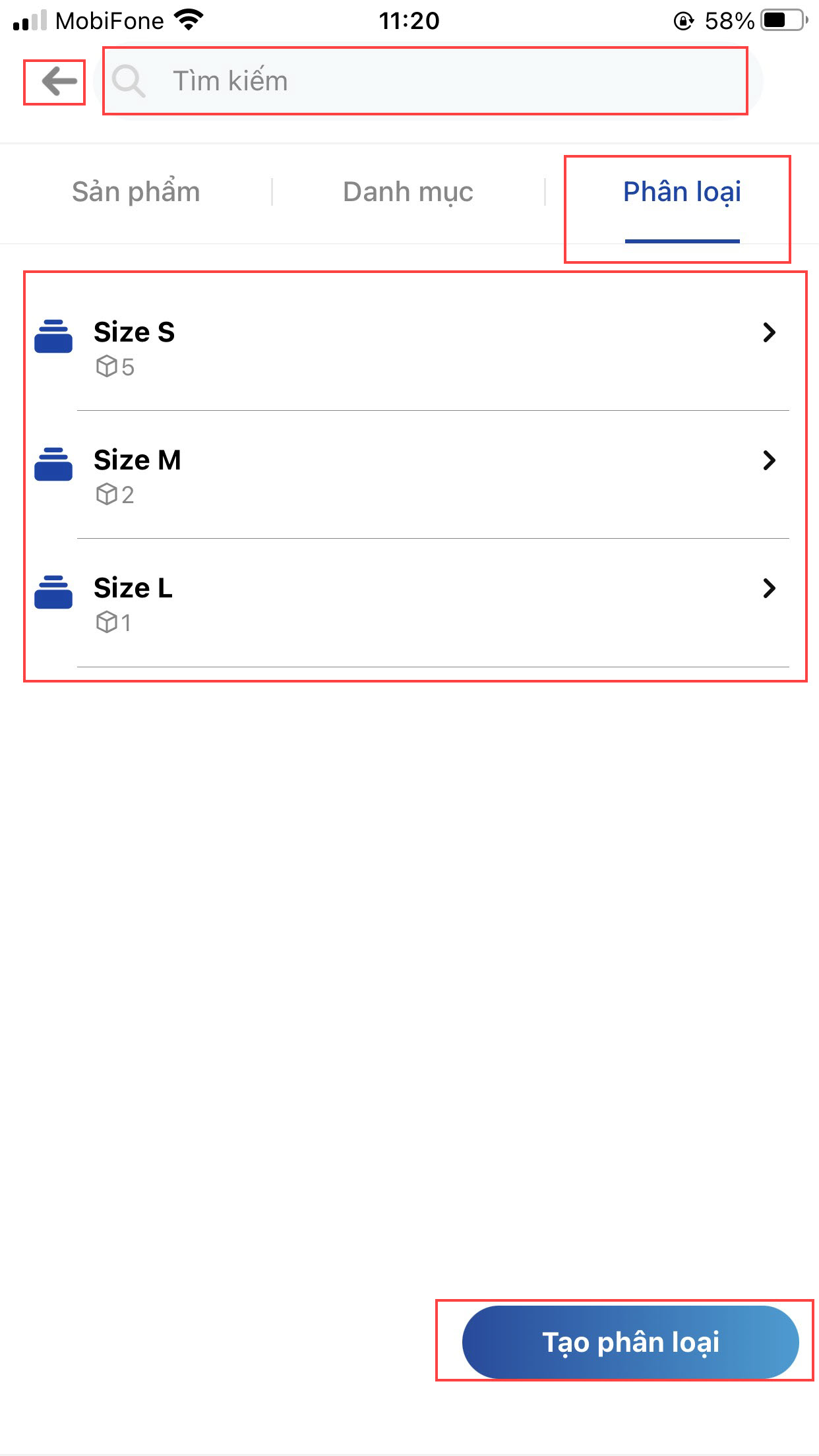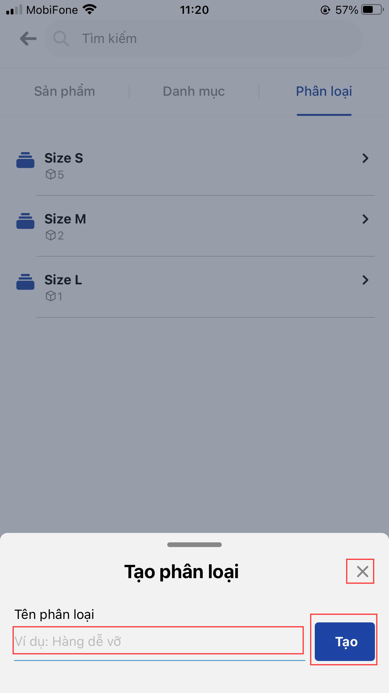 Để thêm mới phân loại sản phẩm, bạn chọn nút "Tạo phân loại", nhập tên phân loại và sau đó chọn nút "Tạo"