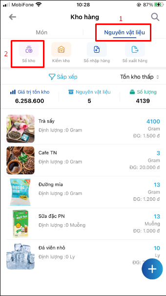 Trong quản lý "Kho hàng" >> chọn tab "Nguyên vật liệu" >> chọn "Sổ kho"