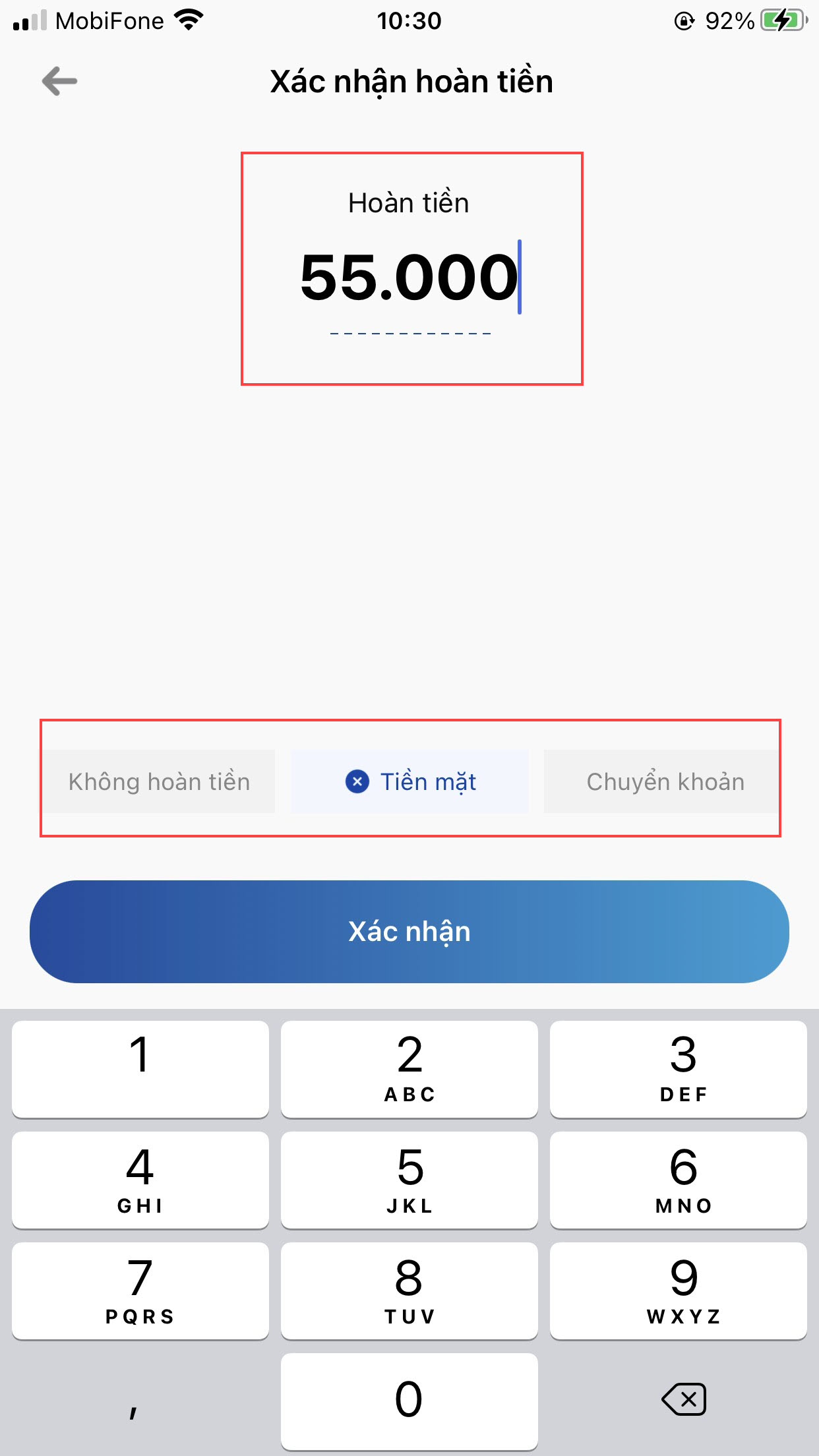 Bước 5: Xác nhận hoàn tiền: nhập số tiền hoàn, chọn hình thức hoàn tiền: Không hoàn tiền / Tiền mặt /Chuyển khoản.
