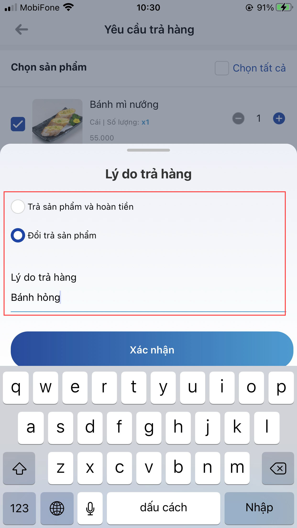 Nhập Lý do trả hàng và chọn nút "Xác nhận".