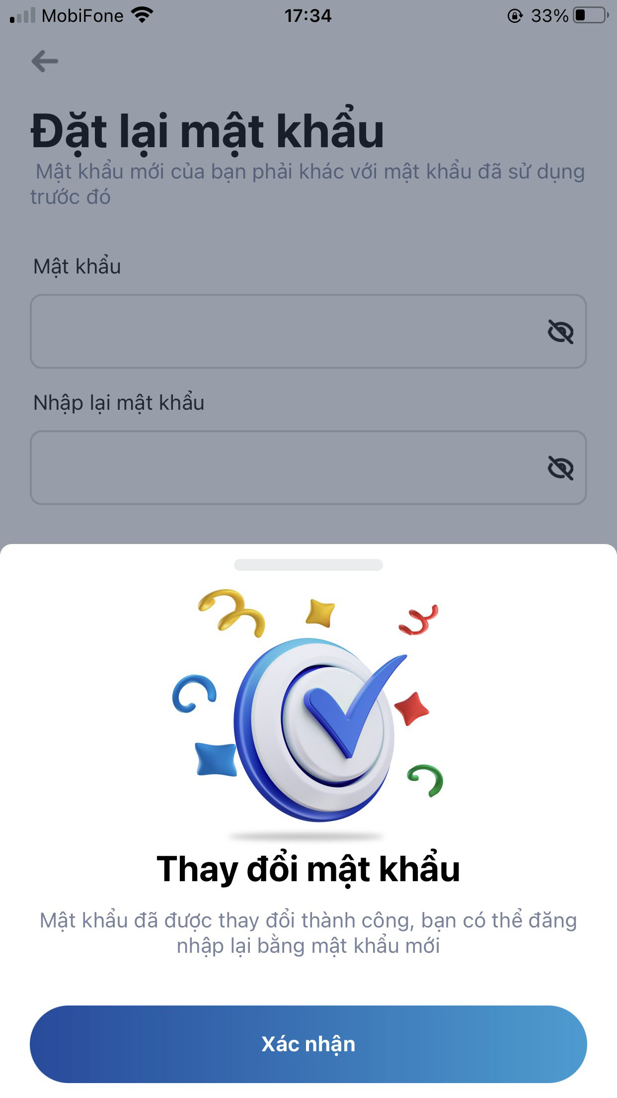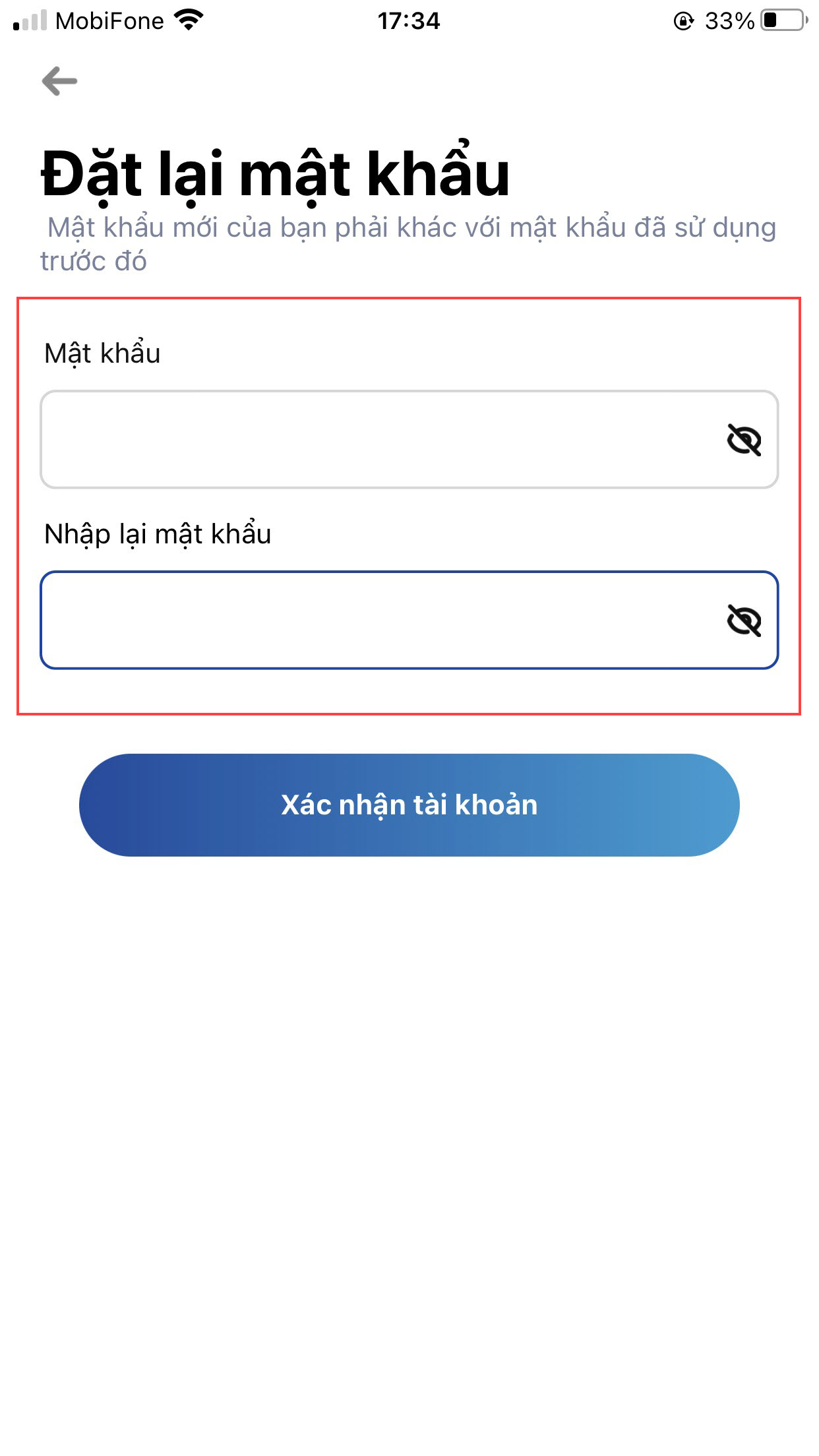 Bước 5: Sau khi xác nhận thành công, bạn đặt lại mật khẩu mới và chọn nút "Xác nhận tài khoản"