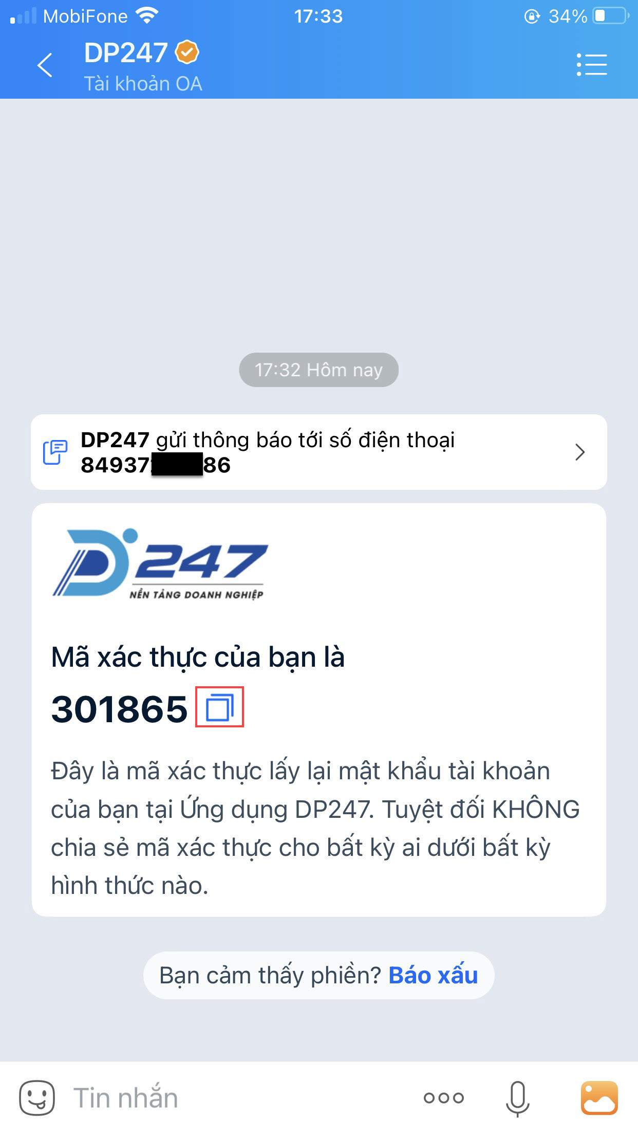 Bước 3: Mã OTP được gửi vào zalo DP247, bạn vào tin nhắn zalo và sao chép mã dán lại màn hình xác minh mã