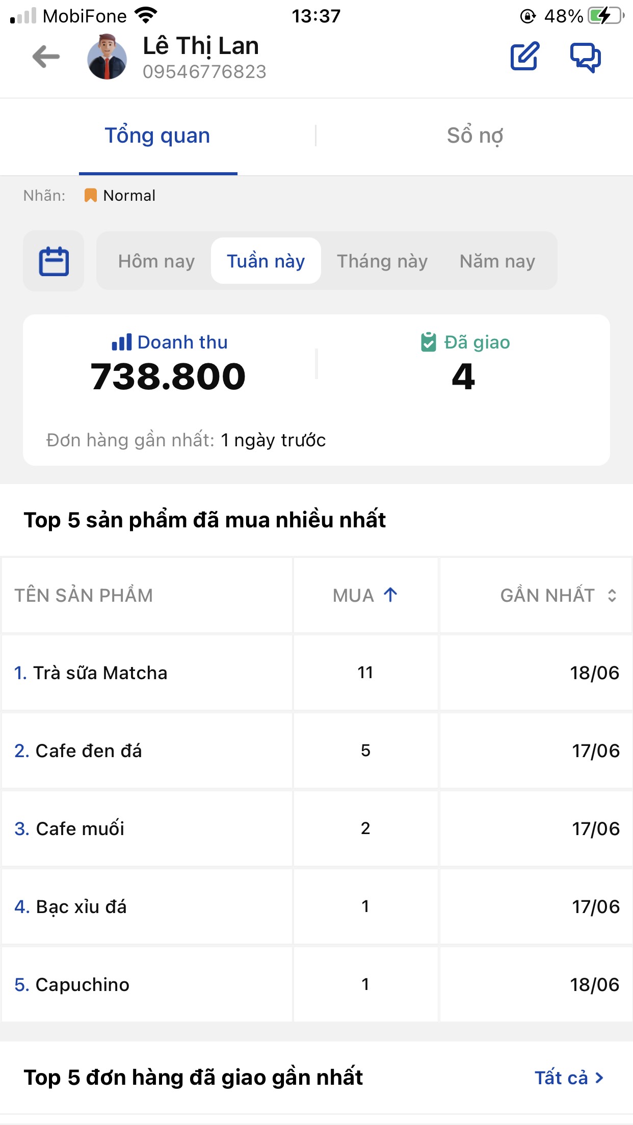 - Xem thông tin: nhãn dán khách hàng, doanh thu, top 5 sản phẩm mua nhiều nhất, top 5 sản phẩm đã giao nhiều nhất