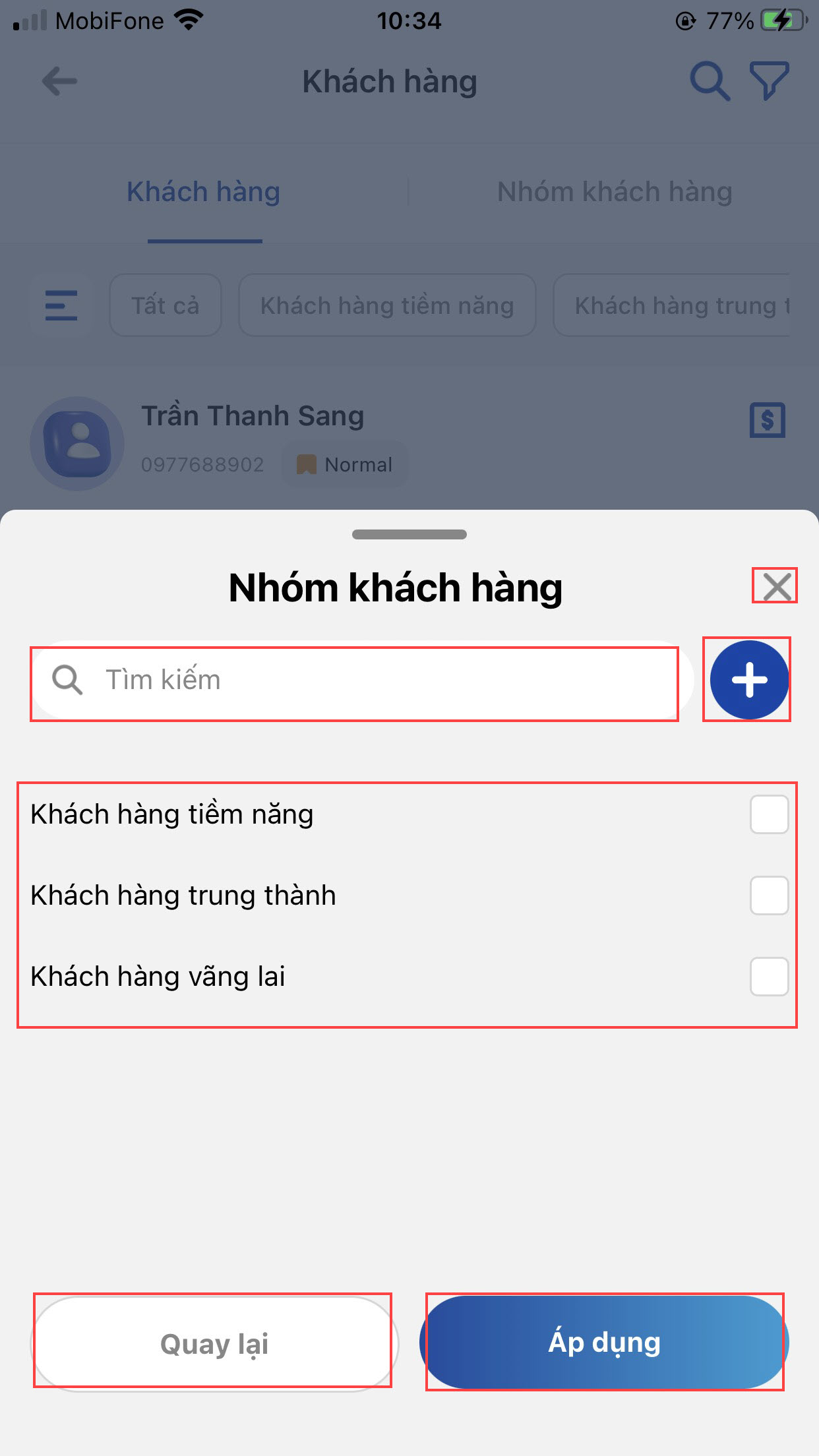 nhập tên nhóm khách hàng để tìm kiếm nhanh. - Click chọn nhóm khách hàng (có thể chọn nhiều nhóm).