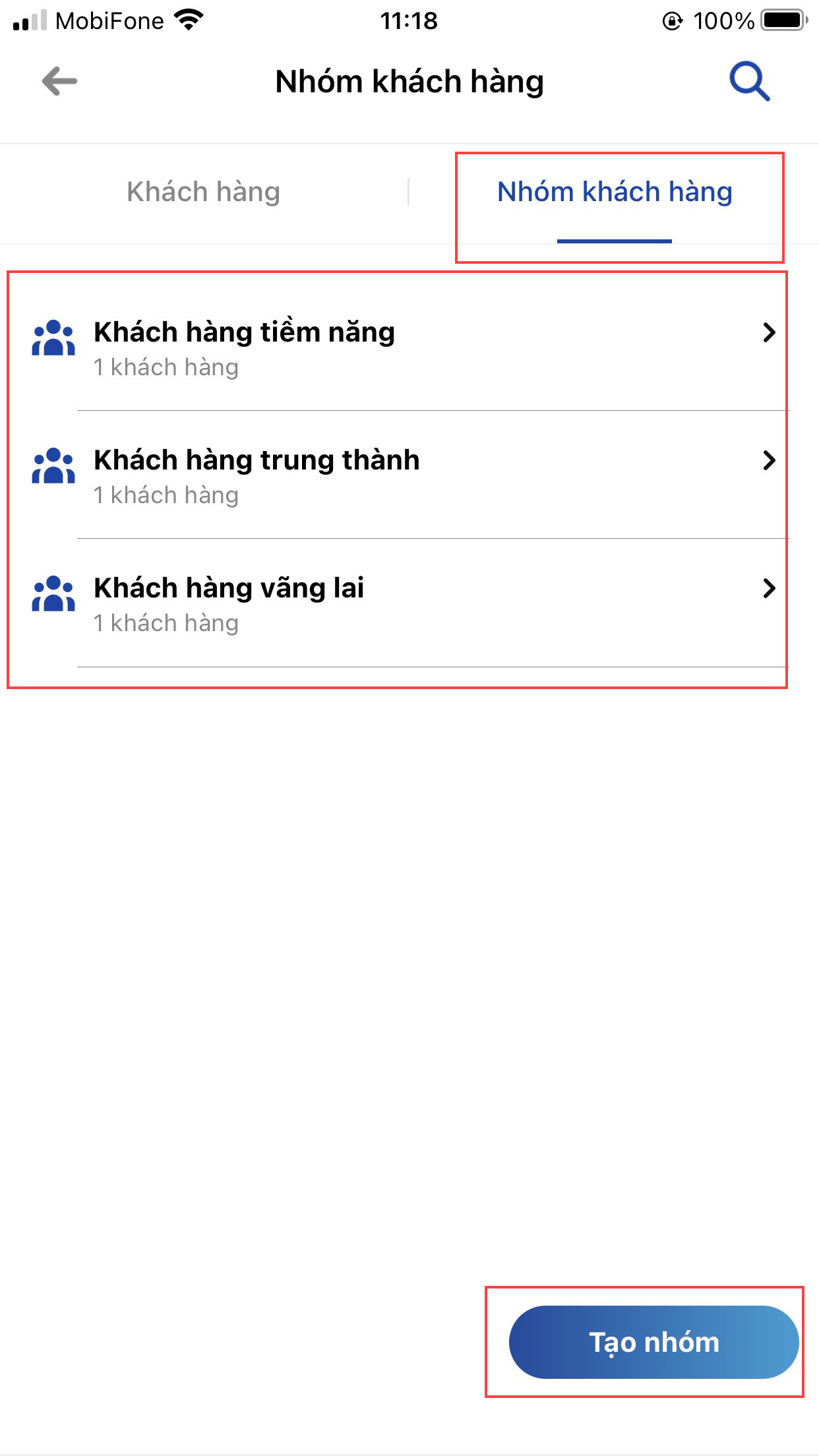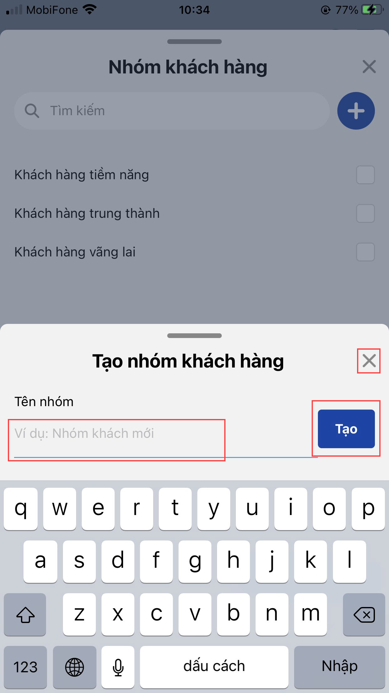 Trên giao diện quản lý nhóm khách hàng, bạn chọn nút "Tạo nhóm": nhập tên nhóm khách hàng sau đó chọn nút "Tạo".