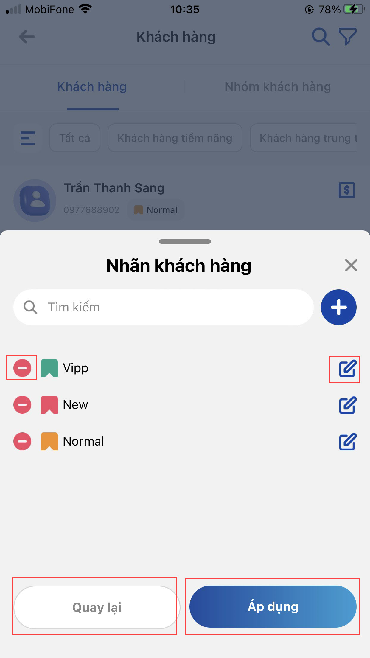 Tại mỗi dòng ở giao diện chi tiết chỉnh sửa nhãn khách hàng, bạn chọn nút