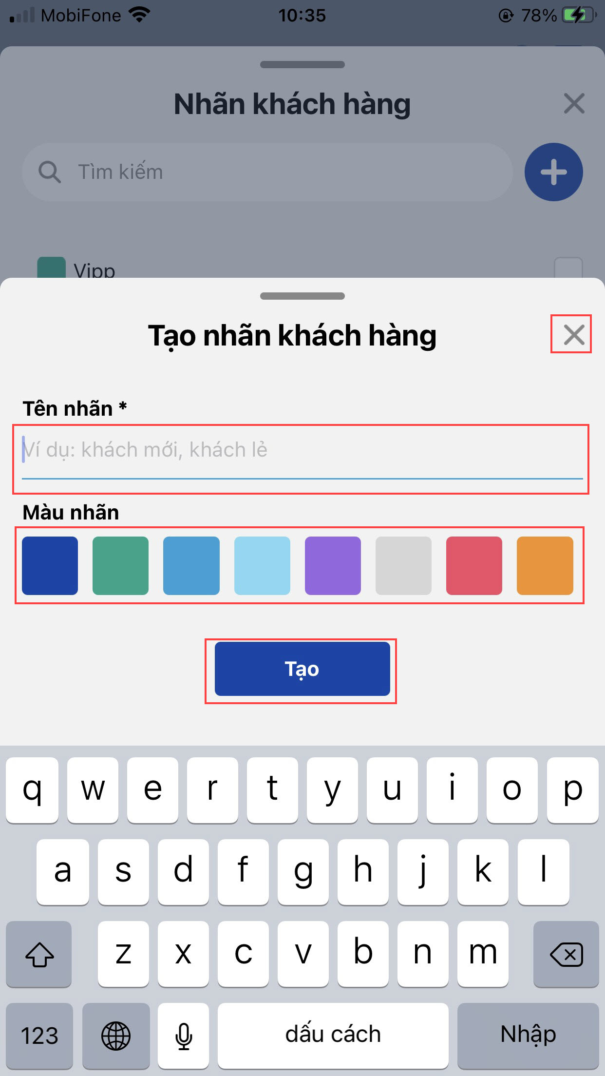 để thêm mới nhãn khách hàng: thao tác: nhập tên nhãn khách hàng, chọn màu nhãn (dễ dàng phân biệt giữa các nhãn) sau đó chọn nút "Tạo".