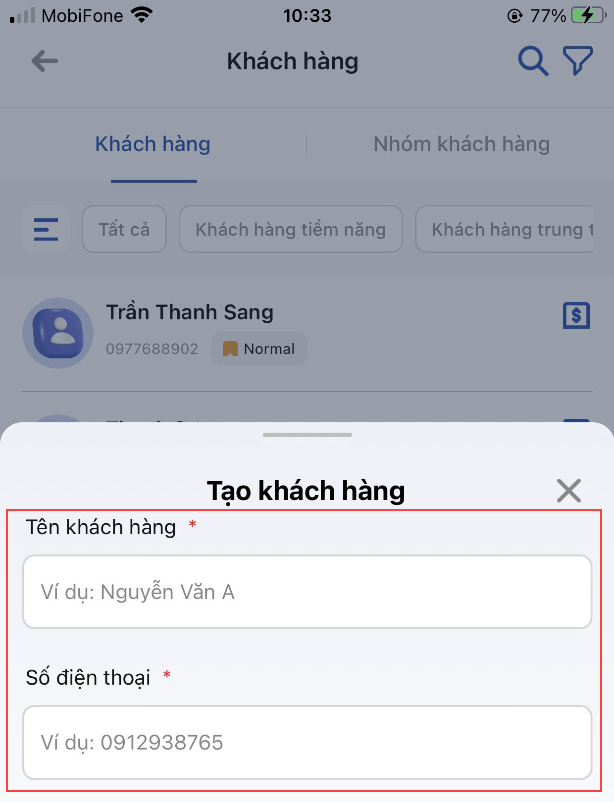 - Nhập số điện thoại khách hàng (bắt buộc nhập)