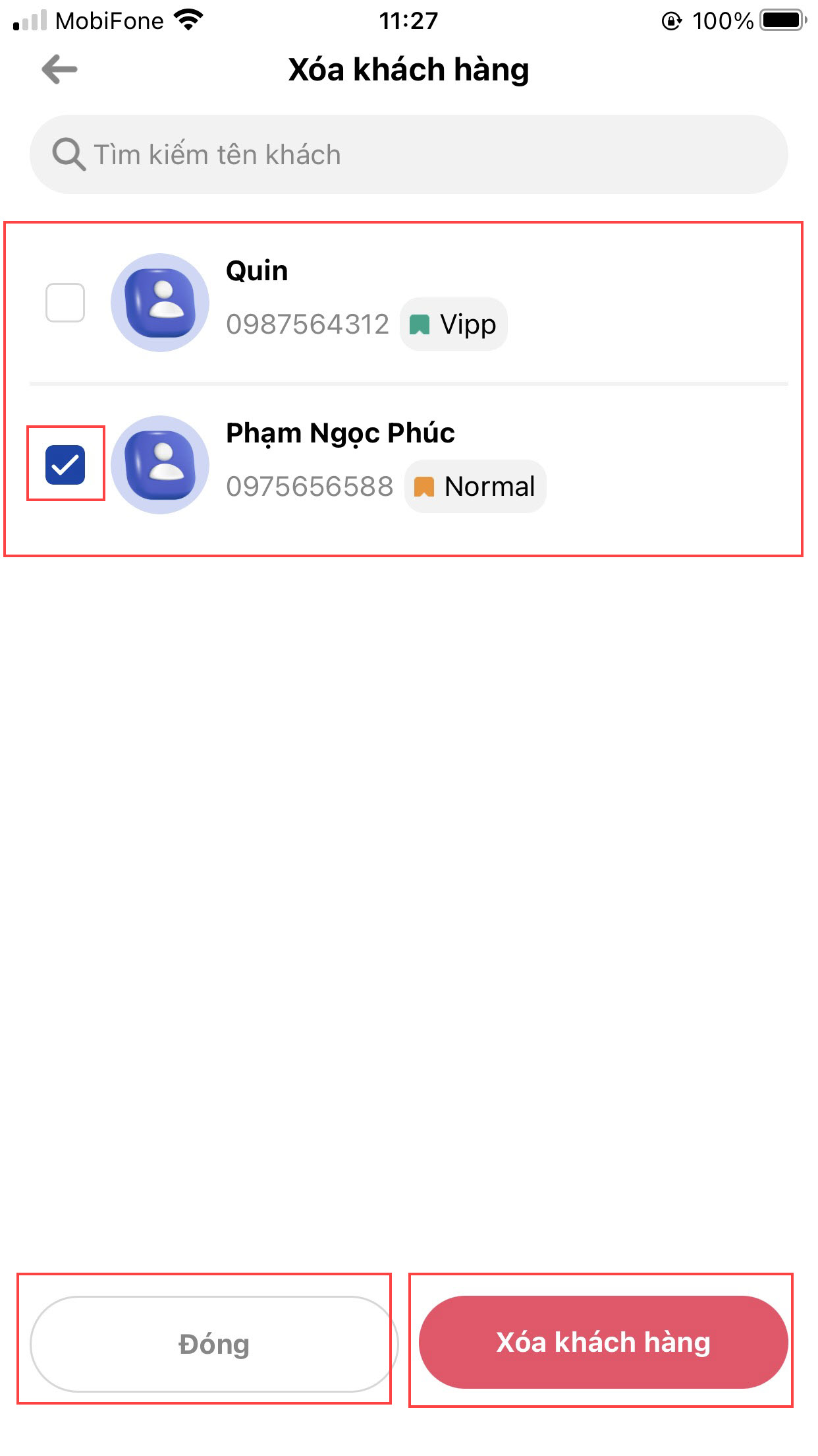 Chọn nút "Xóa khách hàng": Chọn khách hàng cần xóa, chọn nút "Xóa khách hàng". Nút "Đóng" để hủy xóa và đóng lại.