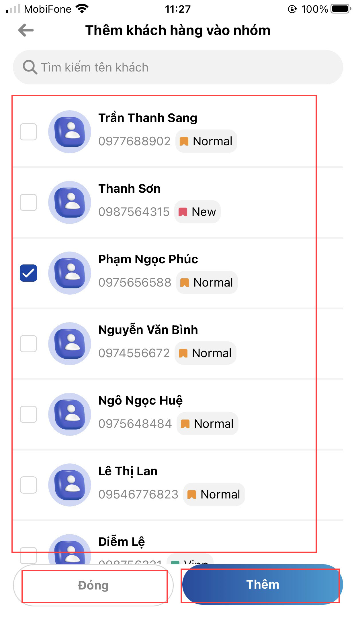 Chọn nút "Thêm khách hàng": chọn khách hàng cần thêm vào nhóm, sau đó chọn nút "Thêm". Nút "Đóng" để hủy thêm và đóng lại.