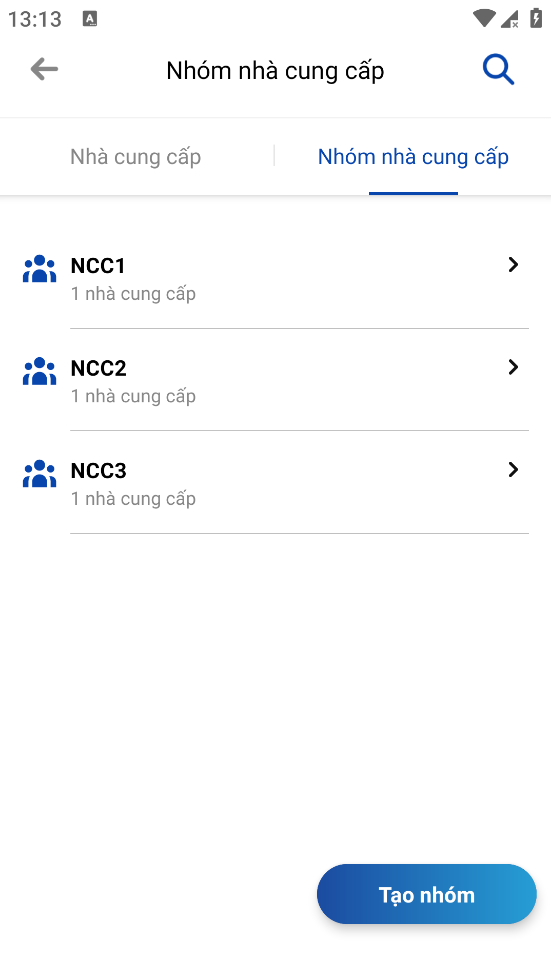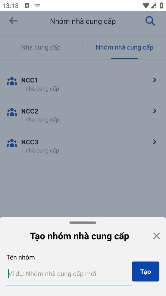 Trên giao diện danh sách nhóm nhà cung cấp chọn nút "Tạo nhóm" sau đó điền tên nhóm và nhấn nút "Tạo"