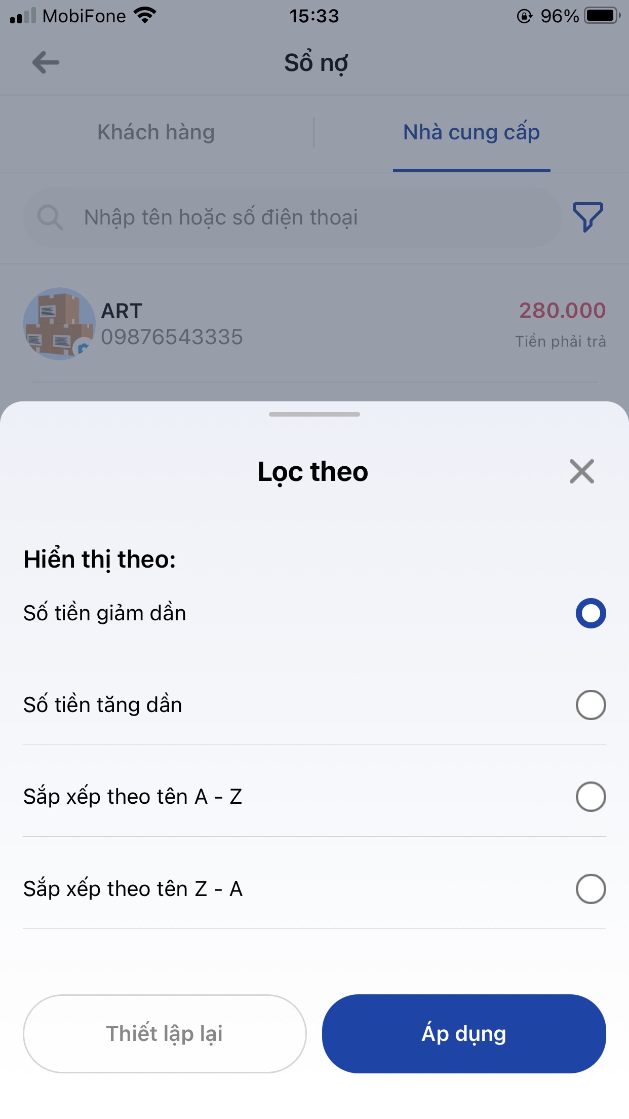 : chọn điều kiện cần lọc và chọn nút "Áp dụng", nút "Thiết lập lại" hủy điều kiện lọc trước đó.