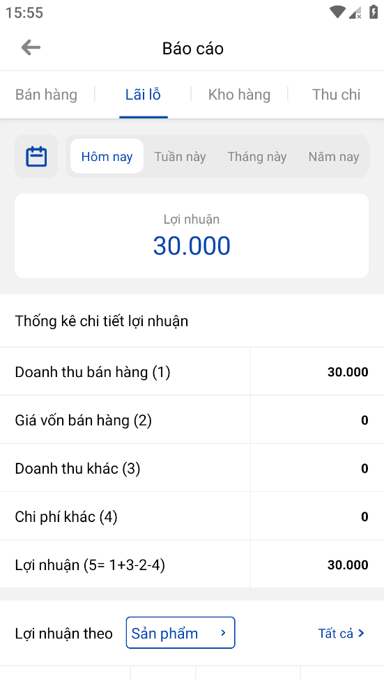 Tại màn hình báo cáo lãi lỗ gồm các thông tin sau: nút mở bộ lọc nâng cao và các nút bộ lọc mặc định, tổng lợi nhuận theo bộ lọc đang chọn, bảng thống kê chi tiết lợi nhuận gồm 5 loại chi phí được hệ thống tính toán và cập nhật tự động.