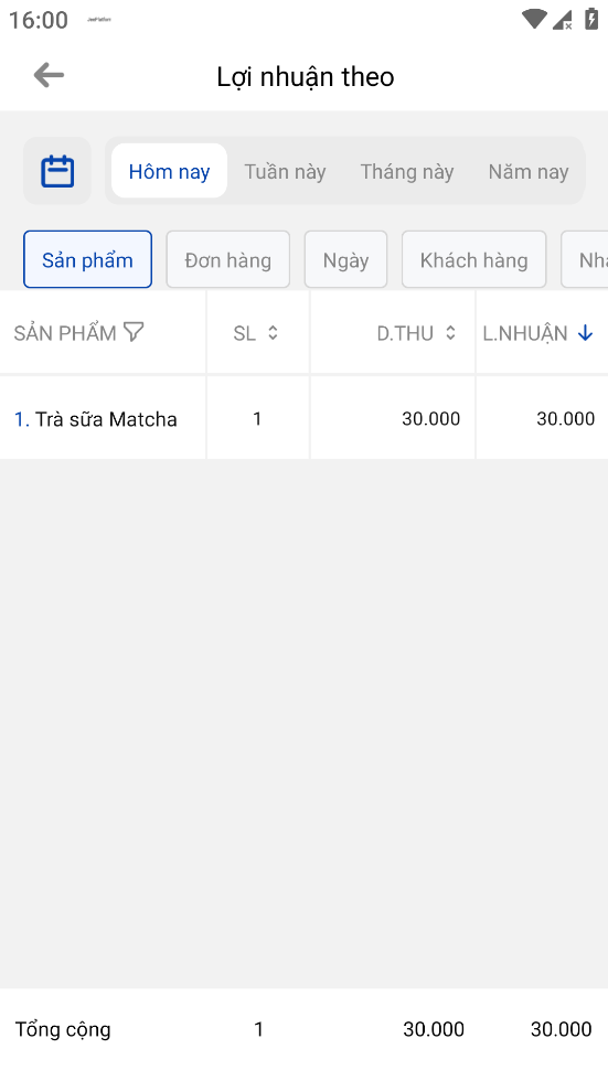 Xem chi tiết lợi nhuận theo các tiêu chí: Sản phẩm, đơn hàng, ngày, khách hàng, nhân viên. Giao diện tương tự nhưng số liệu sẽ thay đổi theo tiêu chí được chọn.