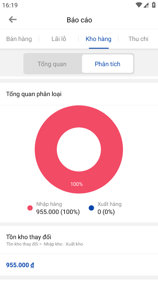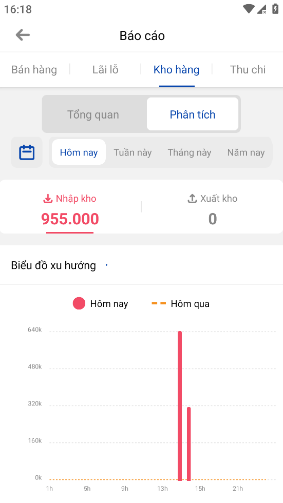 2. Tab phân tích: tại giao diện này bao gồm: nút bộ lọc nâng cao và các nút bộ lọc thời gian mặc định, tổng số liệu nhập kho và xuất kho (có thể click vào để chuyển tab). Biểu đồ cột xu hướng số liệu, biểu đồ tròn tổng quan phân loại so sánh tỷ lệ xuất và nhập hàng và giá trị tồn kho thay đổi.