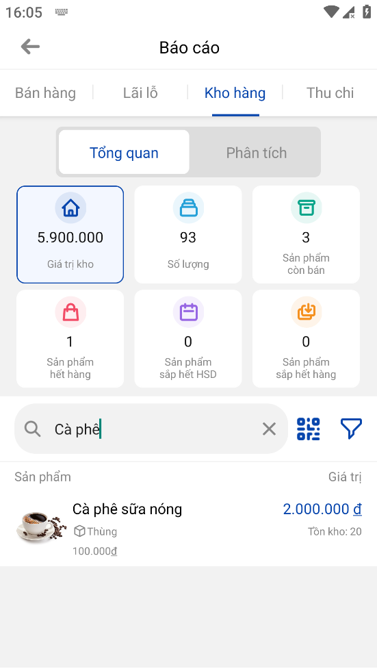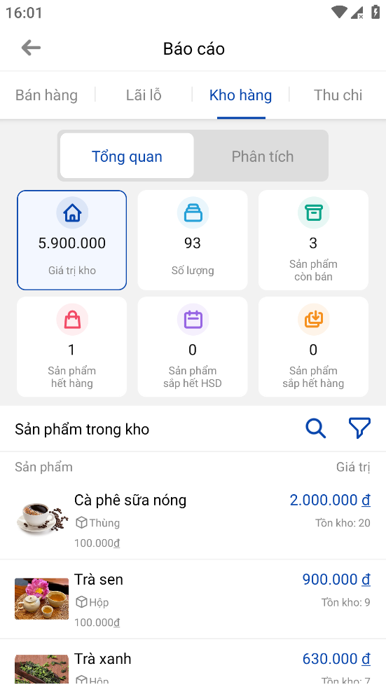 1. Tab tổng quan: đây là tab mặc định hiển thị khi truy cập tính năng. Tại giao diện này bao gồm: số liệu tổng giá trị kho, tổng số lượng sản phẩm/món, số lượng sản phẩm còn bán, số lượng sản phẩm hết hàng, số lượng sản phẩm hết hạn sử dụng và số lượng sản phẩm sắp hết hàng. Bên dưới là danh sách sản phẩm hiện có trong kho.