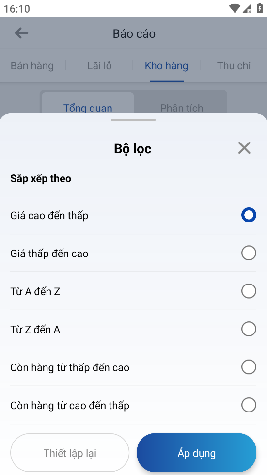 Chọn 1 tiêu chí muốn xem và nhấn nút "Áp dụng" để sắp xếp hoặc nhấn nút "Thiết lập lại" để hủy chọn.
