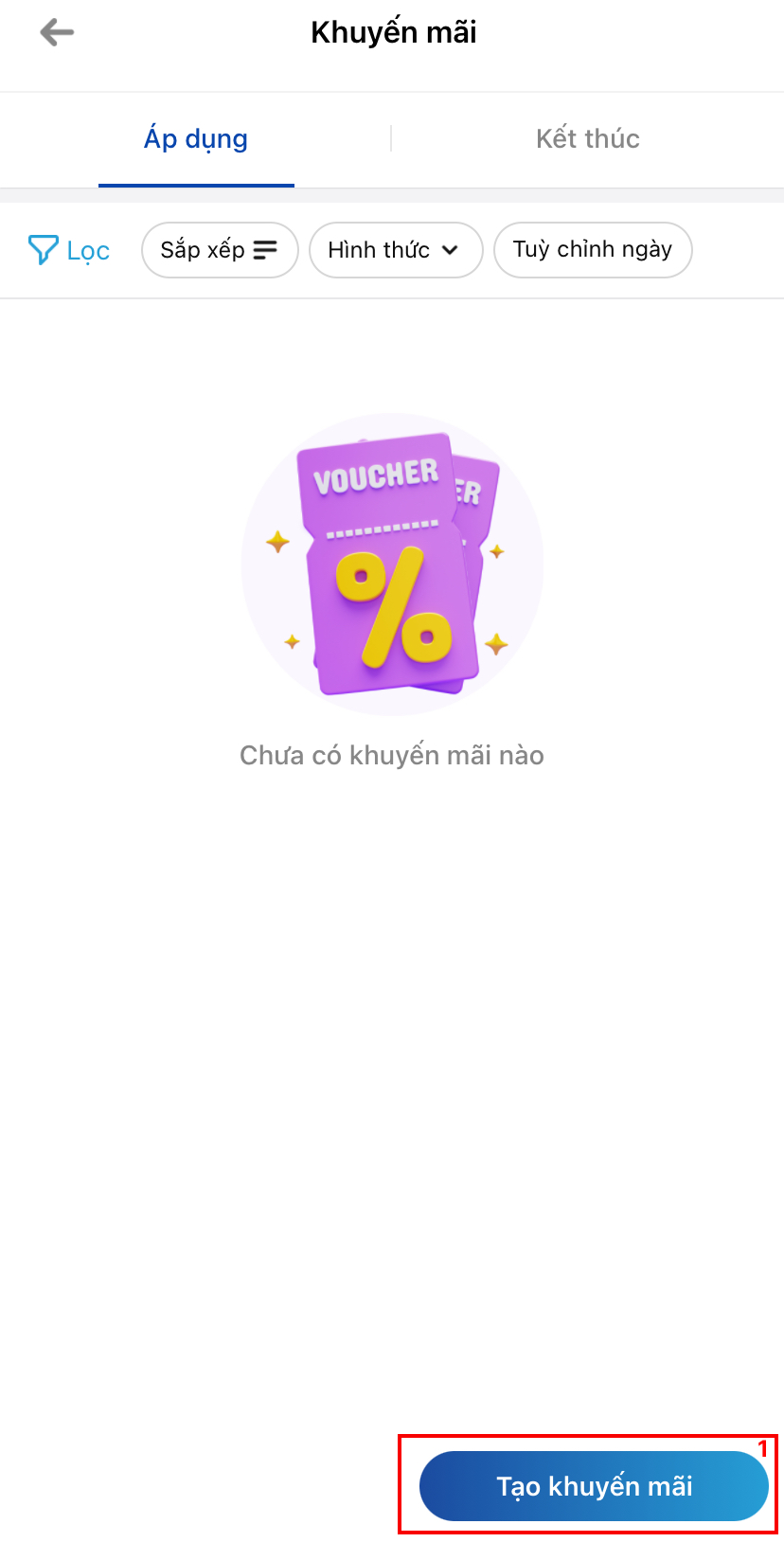 - Bước 1: Tại màn hình Khuyến mãi, bạn click nút "Tạo khuyến mãi"