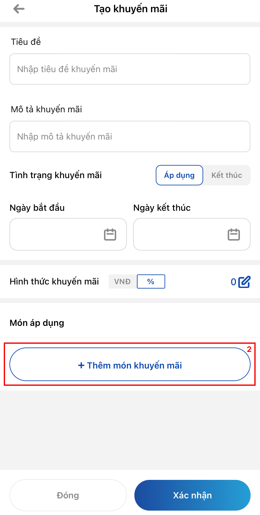- Bước 2: Tại màn hình tạo Khuyến mãi, bạn click vào nút "Thêm món khuyến mãi"