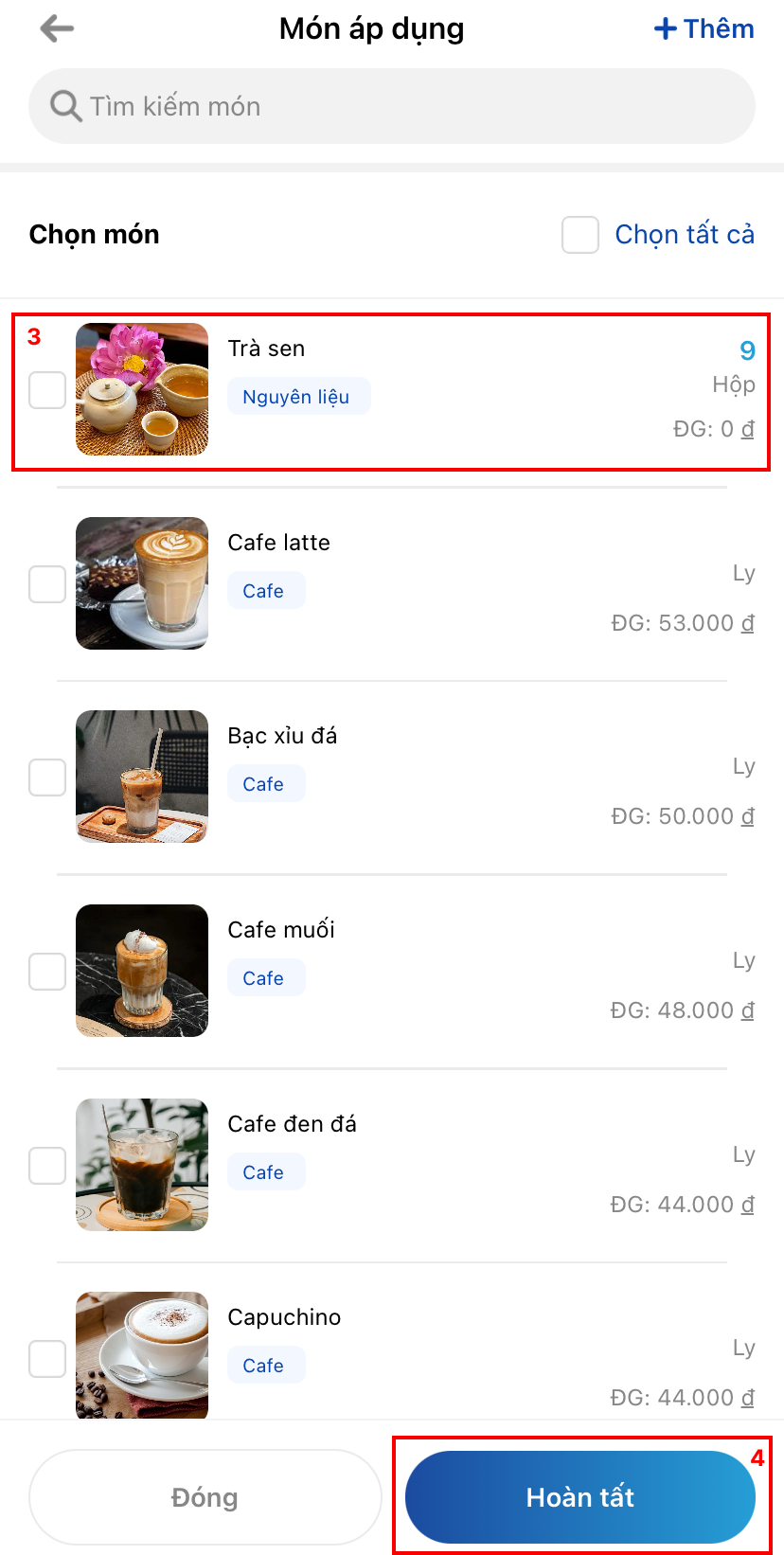 - Bước 4: Bạn click nút "Hoàn tất" để thêm món vào danh sách khuyến mãi