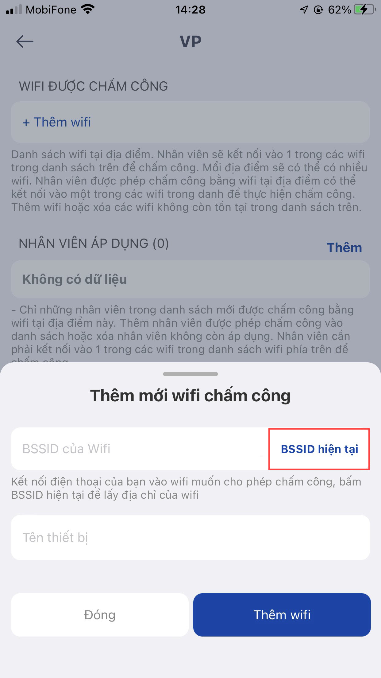 Bước 7: Sau khi click chọn BSSID hiện tại, sẽ hiển thị BSSID và tên wifi mà điện thoại đang kết nối >>Chọn nút "Thêm wifi"