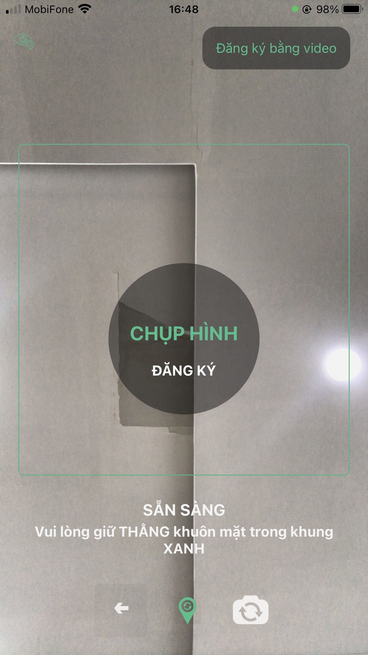 Đăng ký bằng video: chọn nút "Đăng ký bằng video" >> bấm nút "QUAY VIDEO ĐĂNG KÝ" >> vui lòng trong lúc đăng ký xoay mặt nhiều hướng để có thể dễ nhận ra khi chấm công. Sau khi thực hiện các bước như hướng dẫn, đăng ký thành công hiện thông báo "Đăng ký khuôn mặt thành công", lúc này nhân viên có thể tự chấm công bằng khuôn mặt trên điện thoại cá nhân.