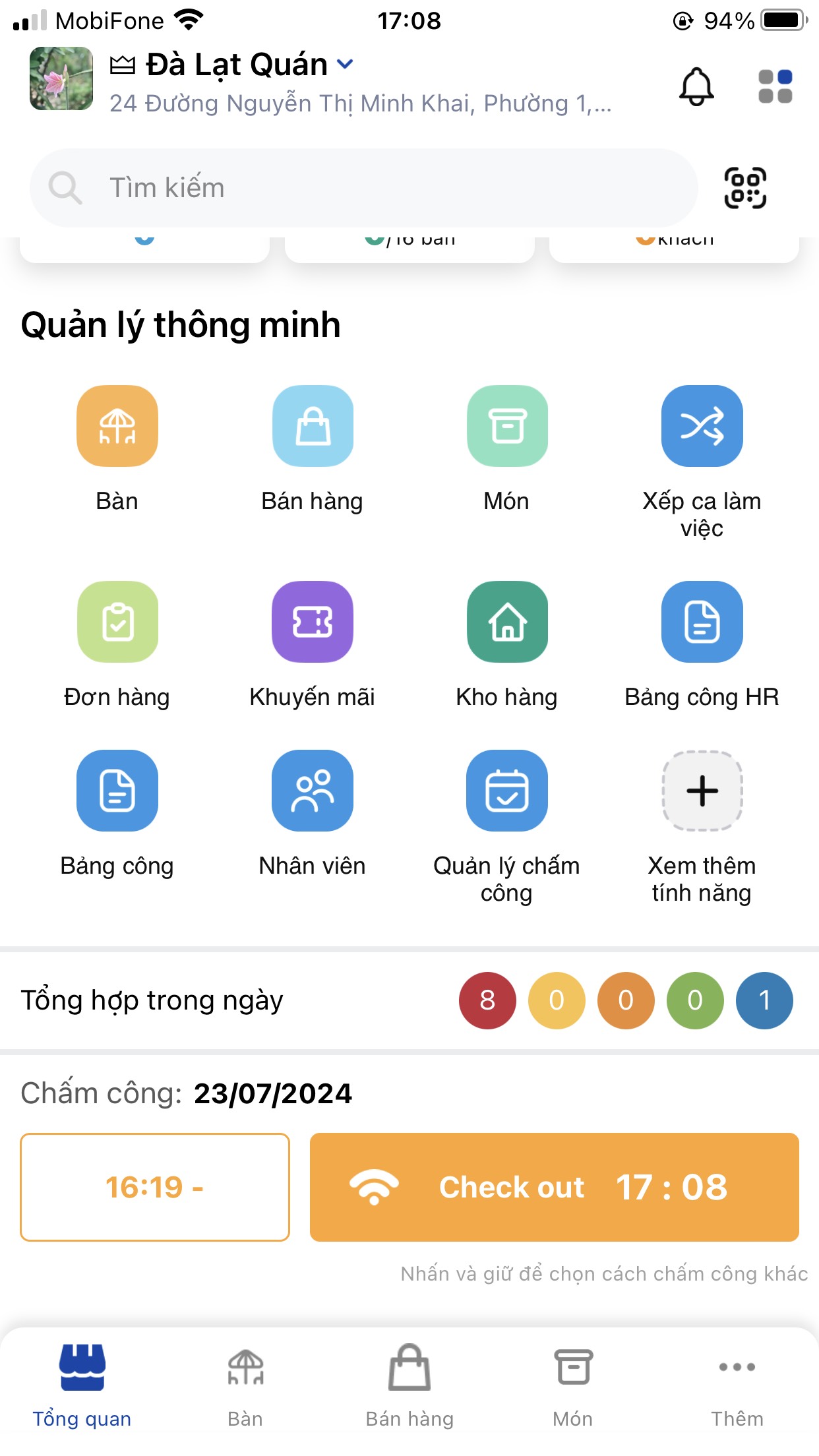 - Chấm công bằng Wifi: chọn nút "Check in" nếu chấm vào, "Check out" nếu chấm ra.