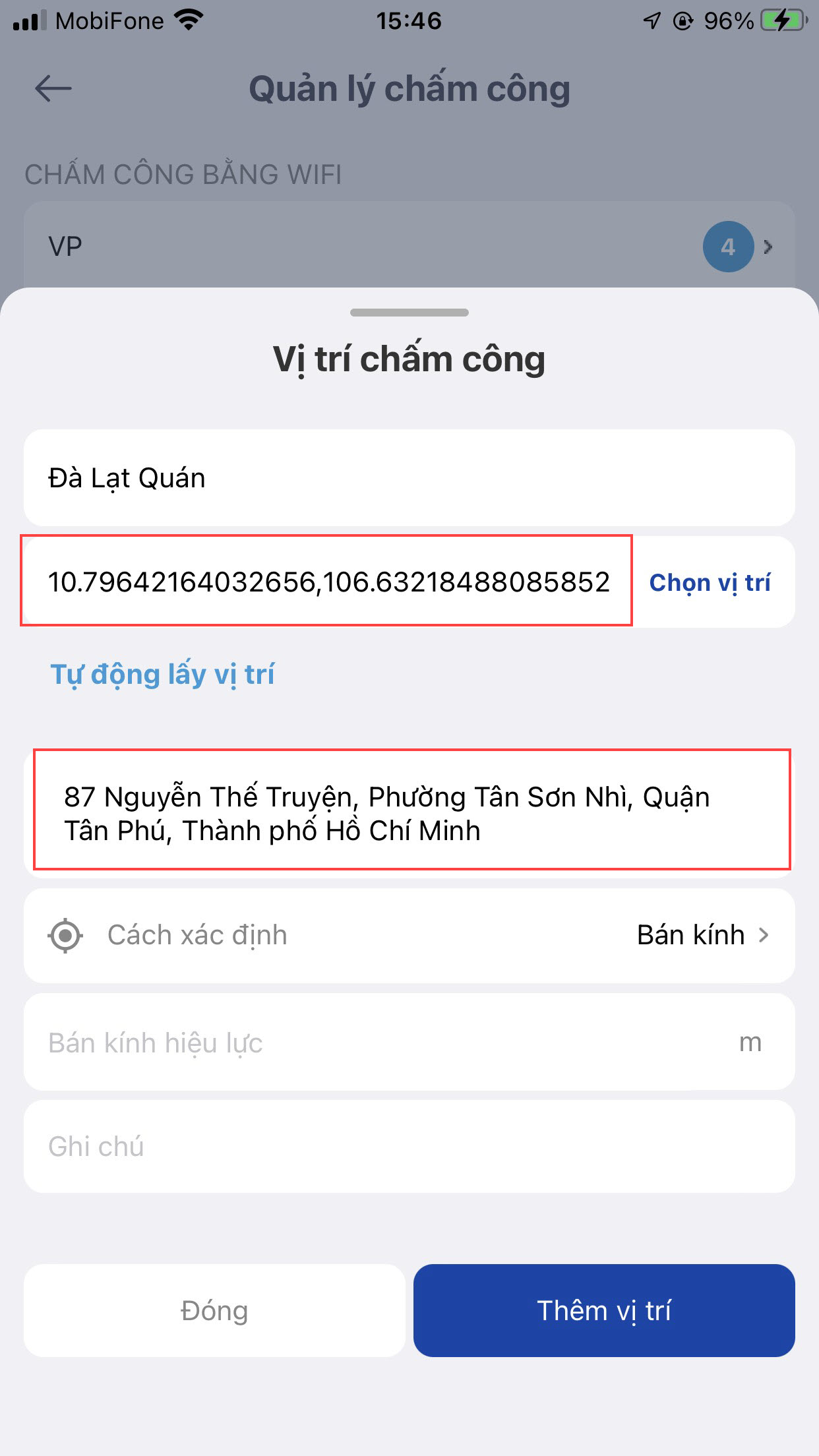 Click nút "Tự động lấy vị trí" để lấy vị trí hiện tại. Hoặc bạn muốn chọn lại vị trí chính xác chọn nút "Chọn vị trí"