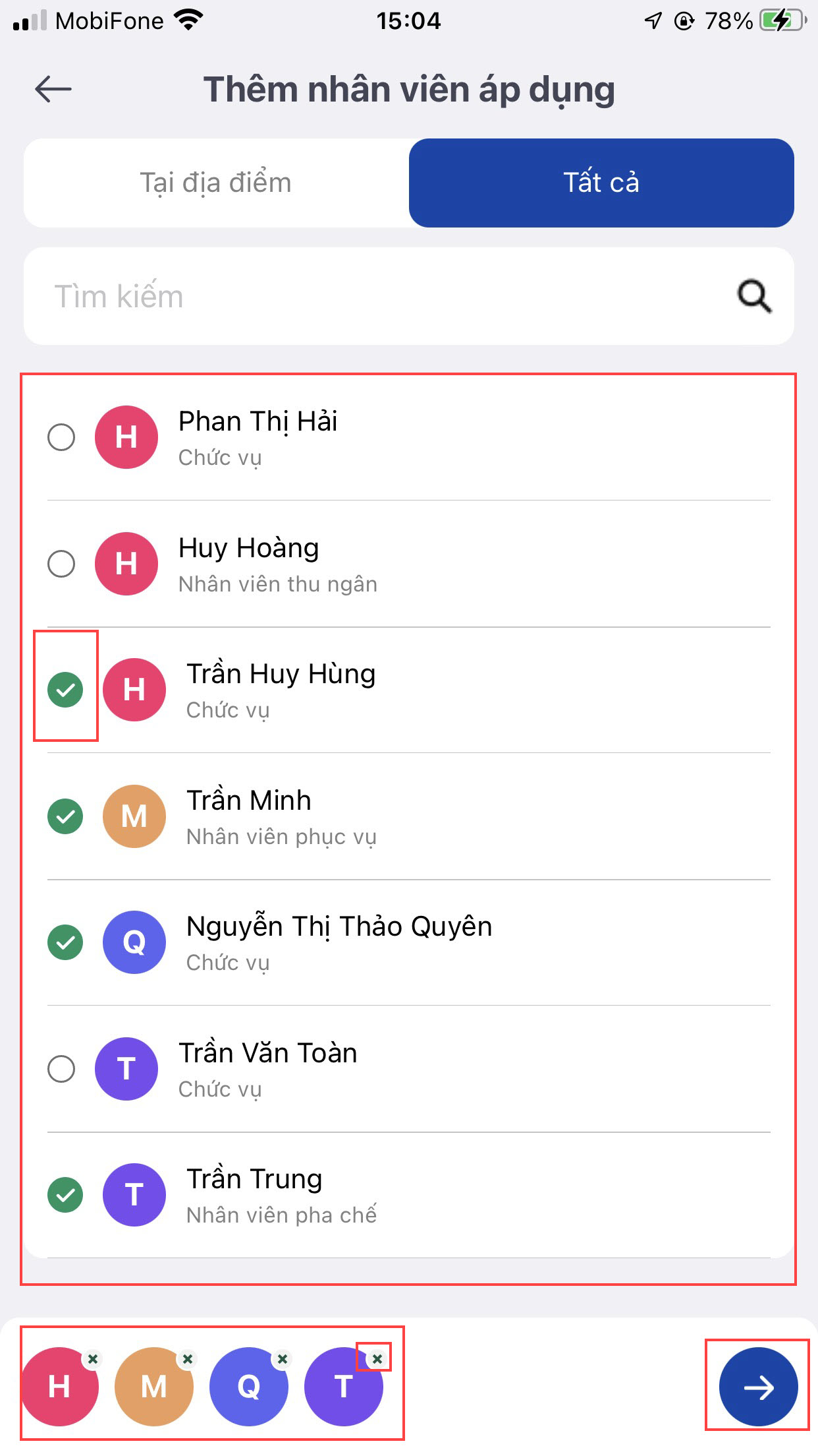 Bước 9: Chọn tab "Tất cả" >> Click chọn nhân viên cần thêm vào địa điểm chấm công. Những nhân viên được chọn sẽ có dấu tick xanh