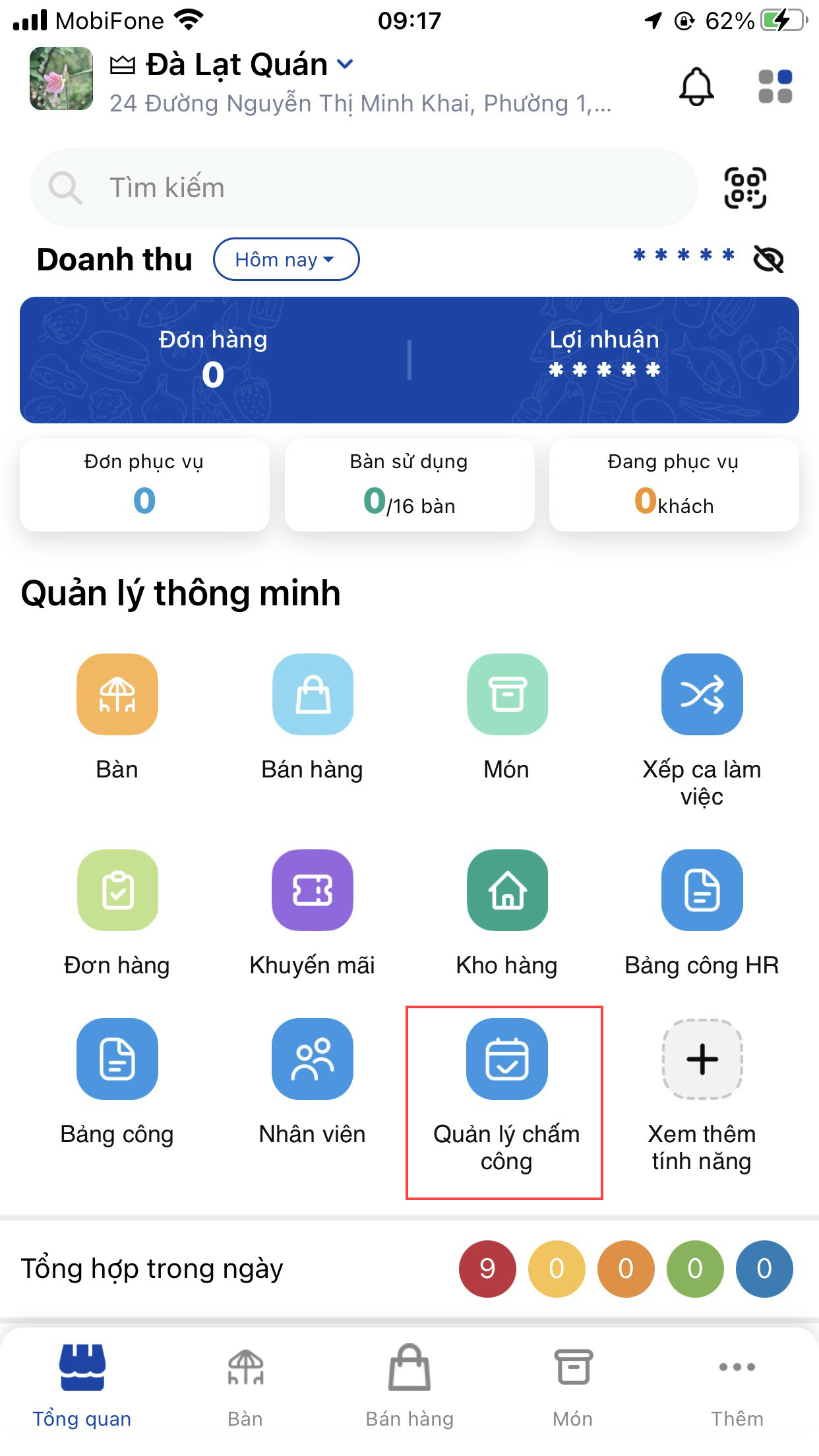 Bạn vào chức năng "Quản lý chấm công", nếu chưa có trên quản lý thông minh thì bạn vào "+Xem thêm tính năng" > Khung chức năng dành cho Nhân sự >> chọn "Quản lý chấm công"