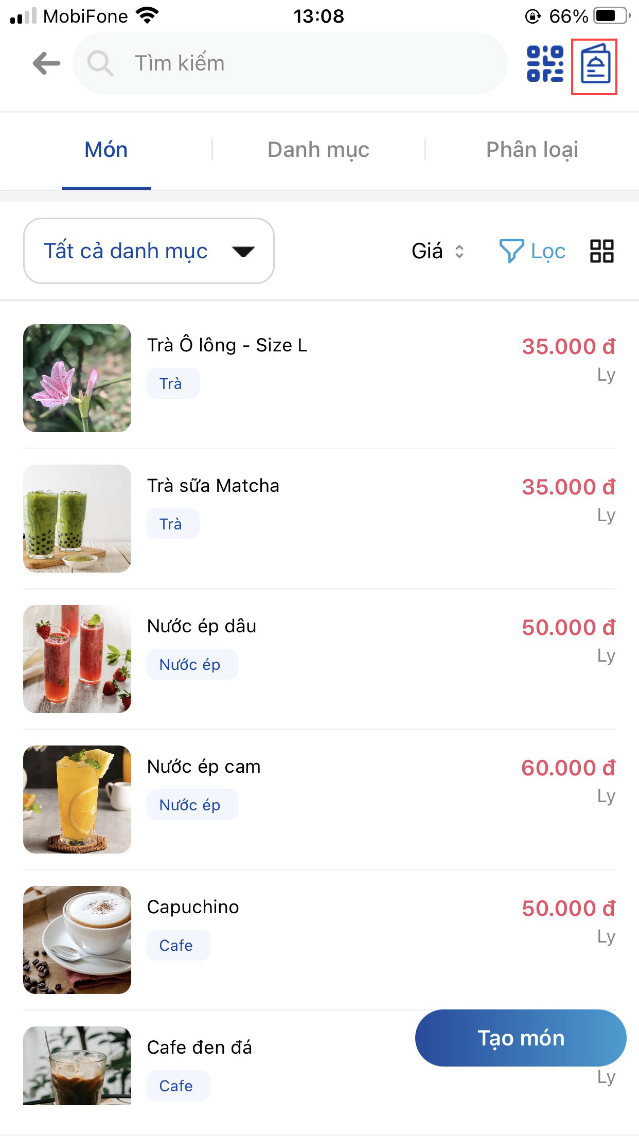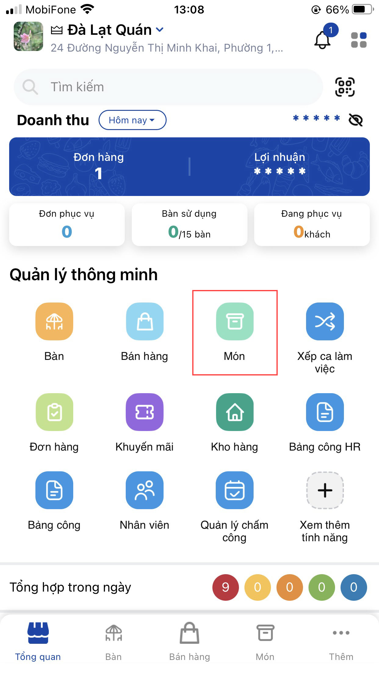 Bước 1: Trên giao diện chức năng chính bạn chọn chức năng "Món"