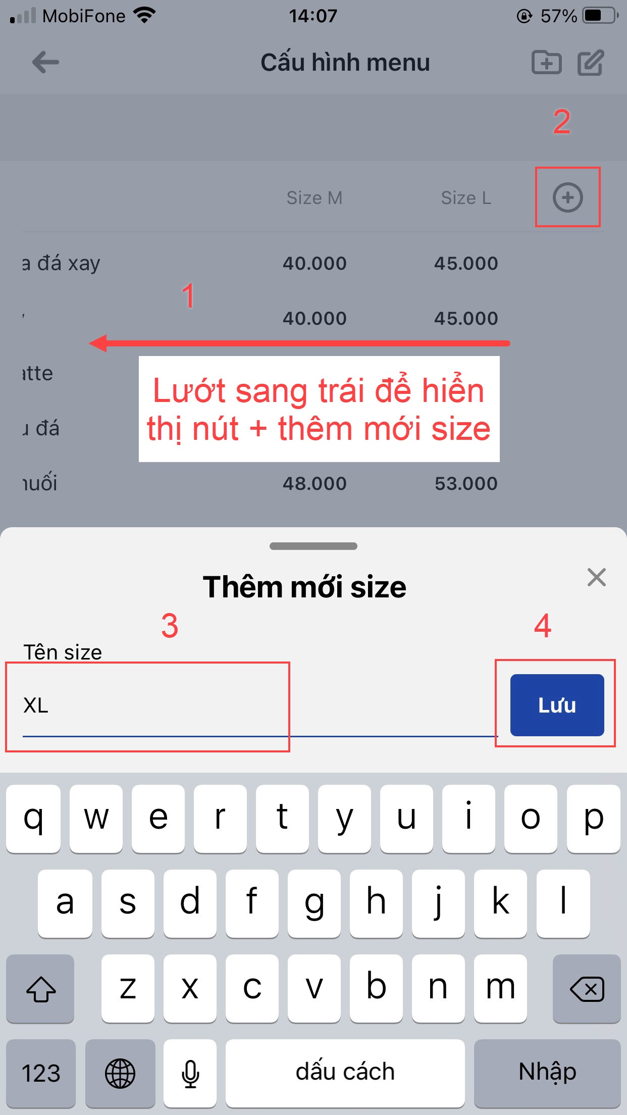 - Trên màn hình cấu hình menu lướt sang trái để hiển thị nút + thêm mới size