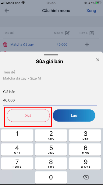 Để xóa size, bạn click vào giá và chọn nút "Xóa"