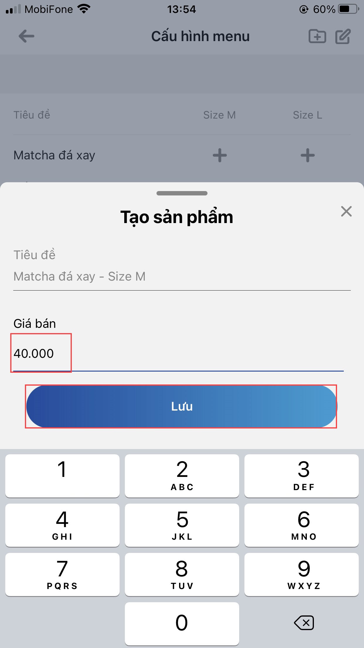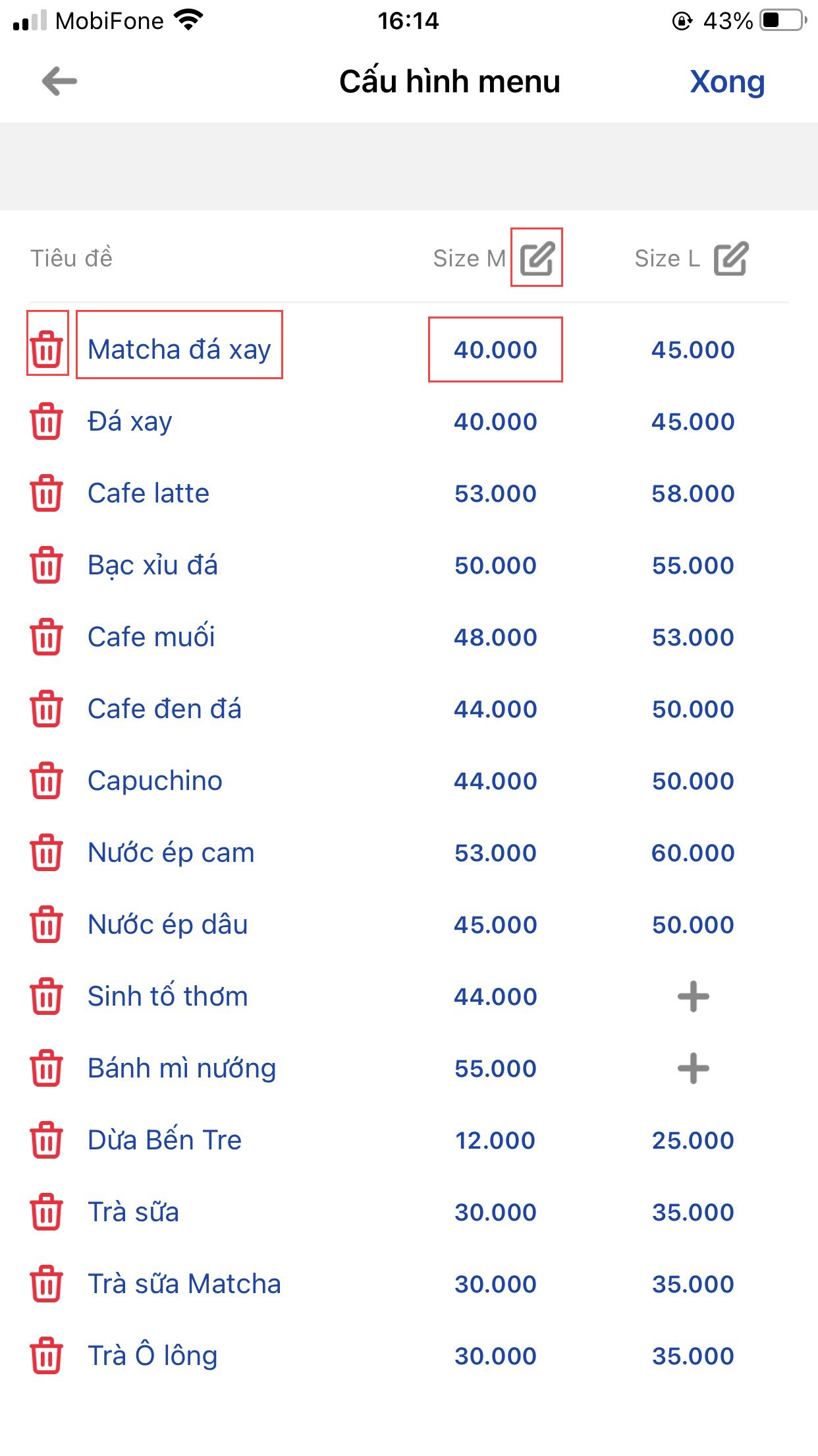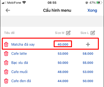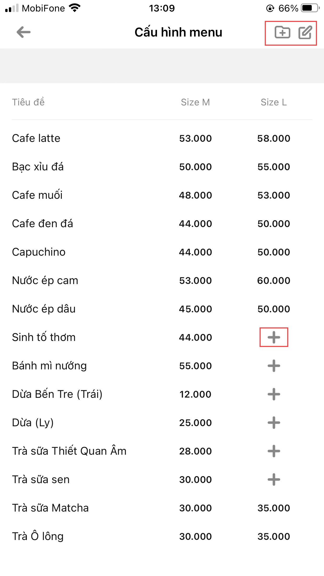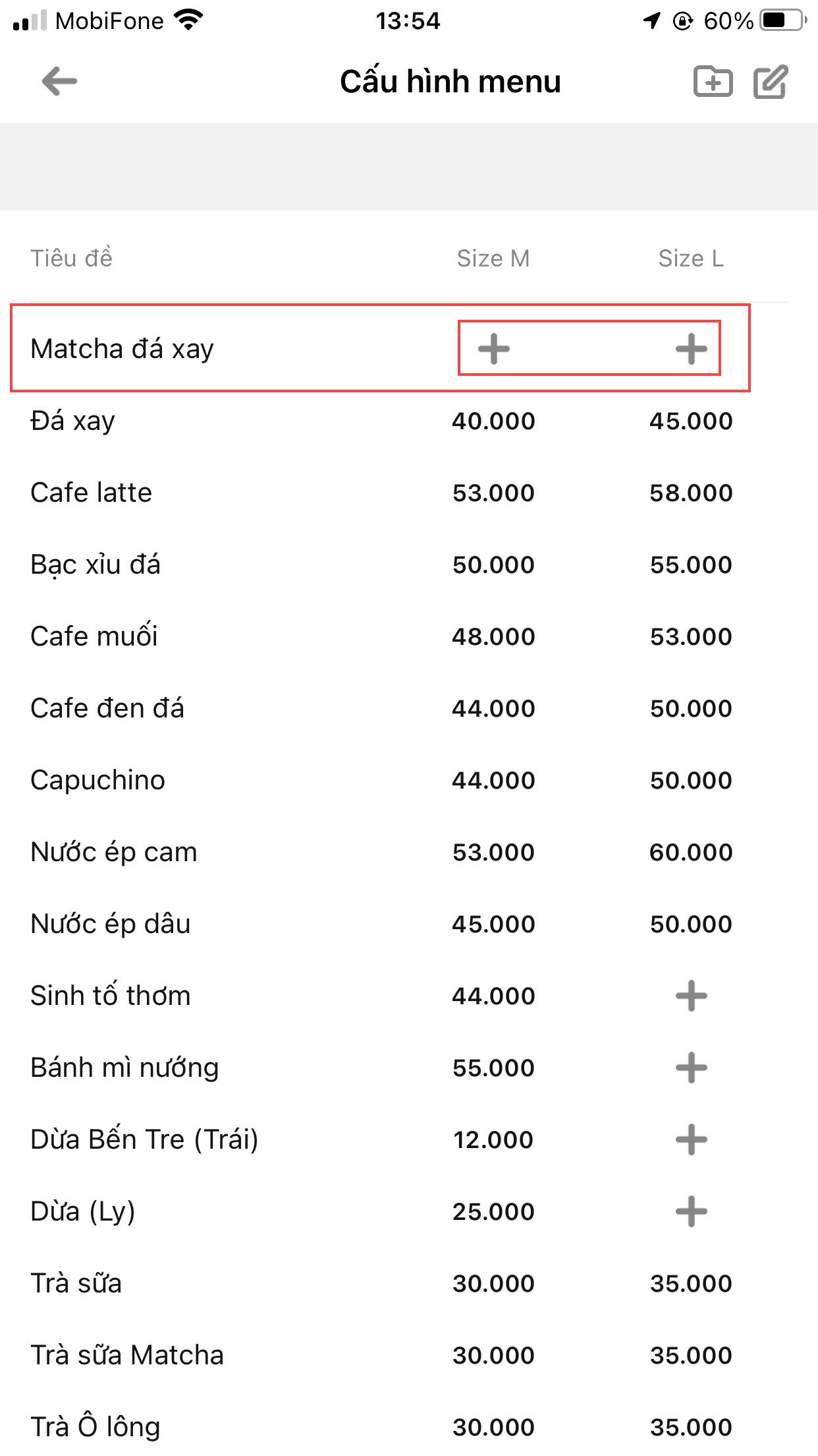 2. Nút "+" trên danh sách menu: để nhập giá bán cho từng size
