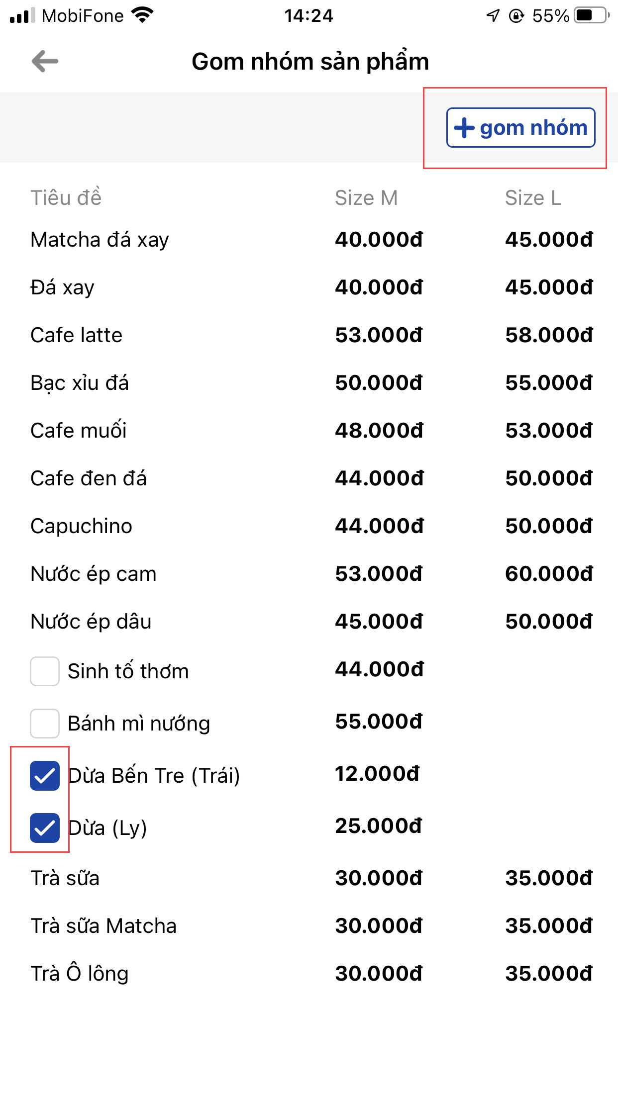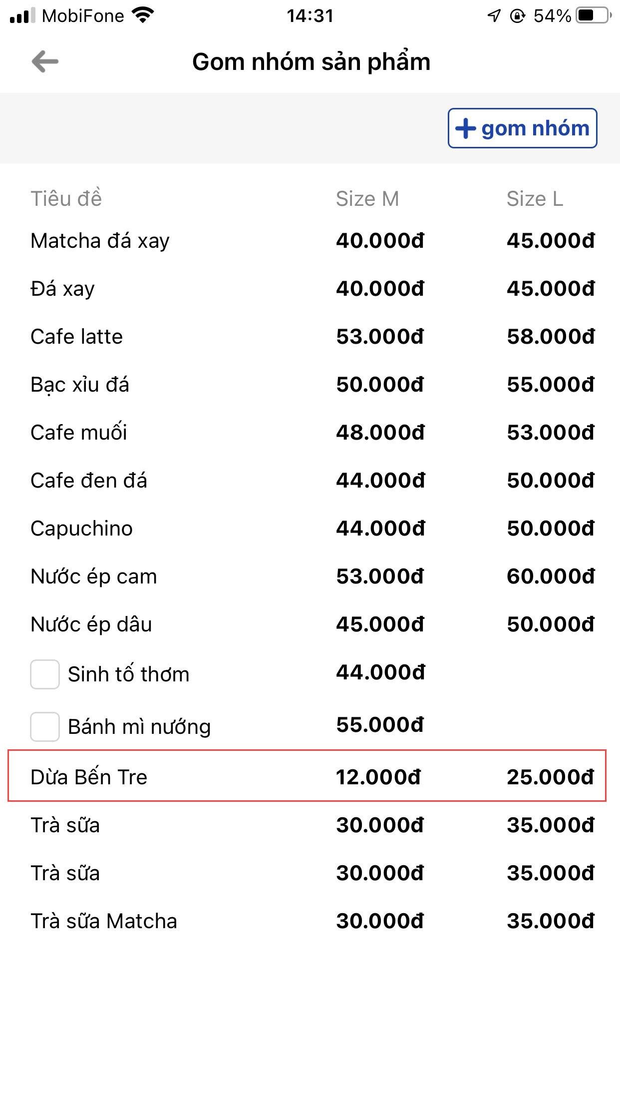 : gom nhóm danh sách món có thể gom nhóm là những món chưa có thêm mới size.