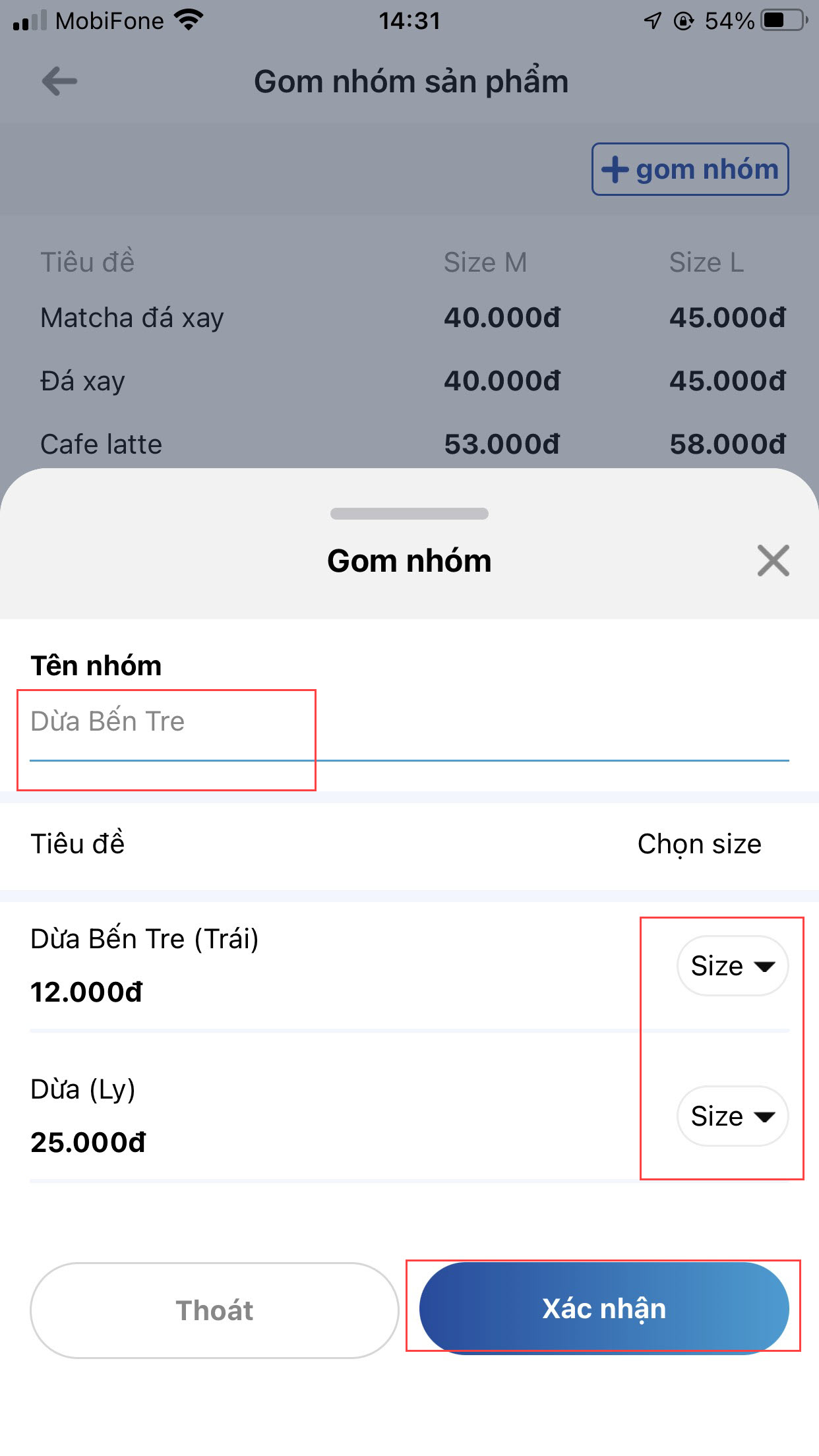 B2: Nhập tên nhóm >> click chọn Size >> chọn nút "Xác nhận"
