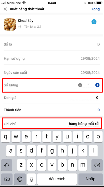 Bước 4: Nhập số lượng thất thoát, nhập ghi chú mặt hàng NVL thất thoát (nếu có) >> chọn nút "Xong".