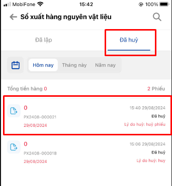 Phiếu sau khi đã hủy nằm trong danh sách tab "Đã hủy"