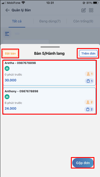 Lưu ý: bàn đặt trước không được phép gộp, bàn nhiều đơn được phép gộp đơn.
