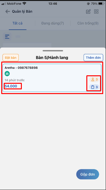 Bước 5: Xem chi tiết bàn đã gộp thành công.