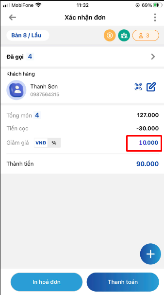 Lưu ý: khi bàn đã gộp thành công thì giảm giá được tính cộng dồn cả 2 bàn gộp và quy ra đơn vị là số tiền VNĐ.