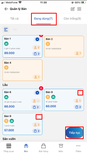Bước 2: Tick chọn bàn cần gộp - 2 bàn trở lên, (lưu ý bàn có