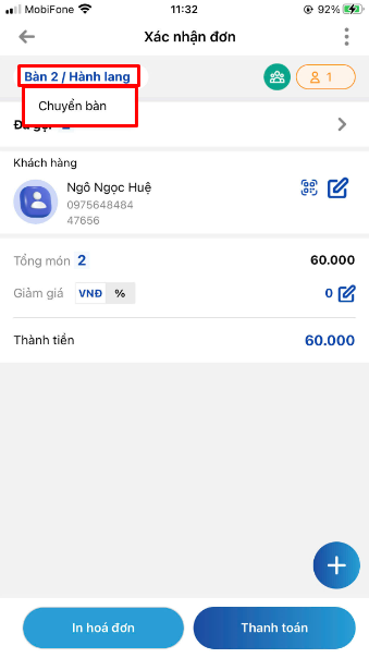 Bước 5: Sau khi chọn nút "Xác nhận" > bàn được chuyển ngay và tên bàn đổi thành tên bàn bạn chọn đổi đến.