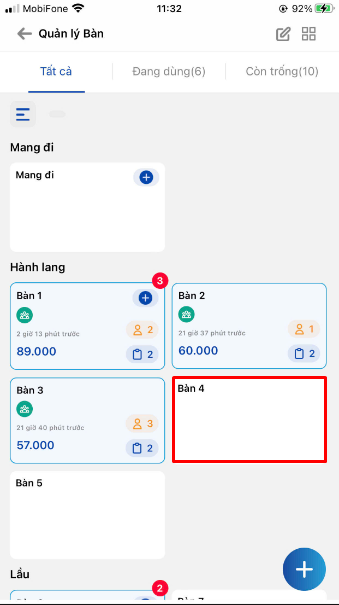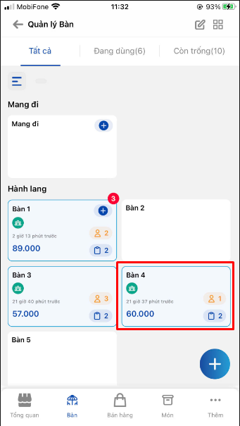 Bước 6: Quay lại giao diện "Quản lý bàn", bạn sẽ thấy sự thay đổi thông tin chuyển từ bàn 2 sang bàn 4 như hình bên dưới.