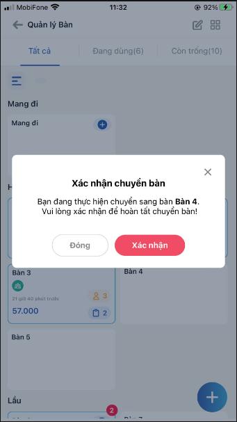 Bước 4: Chọn nút "Xác nhận" để chuyển bàn. Nút "Đóng" hủy chuyển bàn