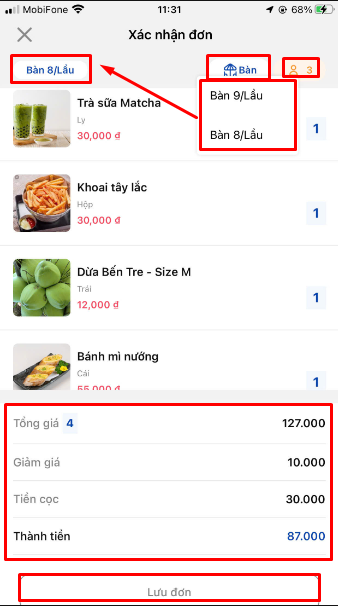 - Chuyển bàn đặt chỗ vào bàn mang đi đang có đơn đã xác nhận